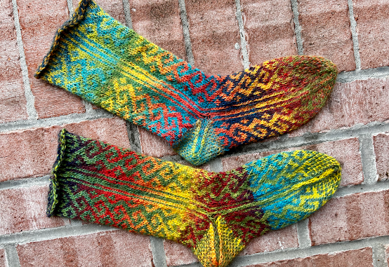 This yarn is quite thin and loosely spun, and a single, so I think that a two color pattern seems appropriate to help it wear better. Regardless, I loved working the changing color patterning so it was a quick knit! Next time I will do a provisional cast on for the heel.